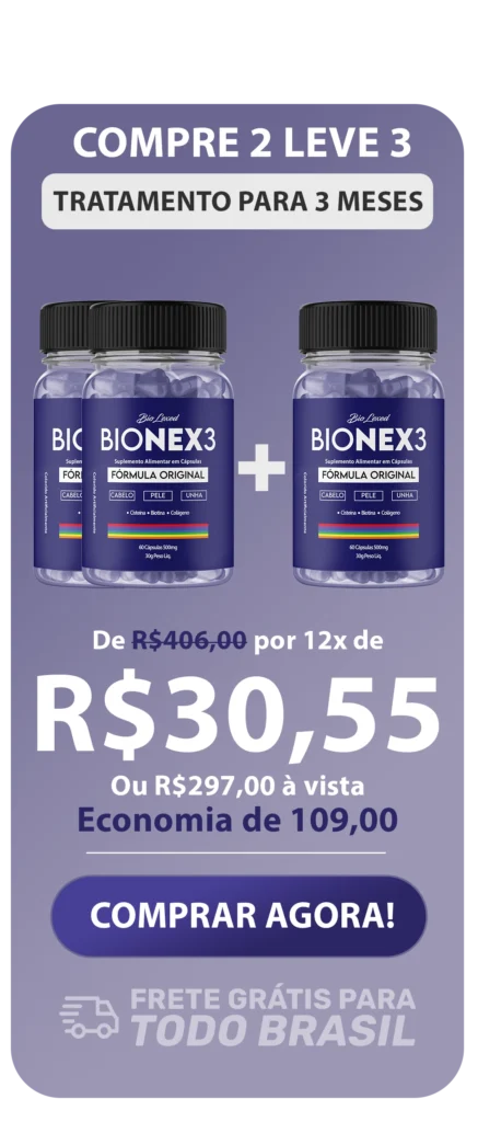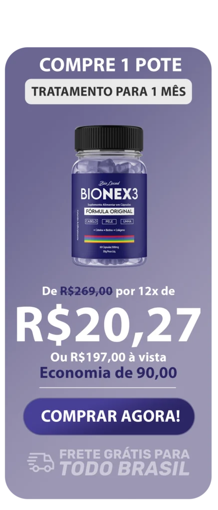 BioNex3 é um suplemento de última geração, desenvolvido cientificamente para melhorar a saúde capilar, da pele e das unhas. Sua composição é 100% natural e segura, feita com uma poderosa combinação de nutrientes essenciais, sem aditivos prejudiciais, garantindo máxima absorção pelo corpo. Com o uso regular, os resultados são visíveis em poucas semanas, proporcionando cabelos, unhas e pele mais saudáveis, com maior vitalidade e beleza.