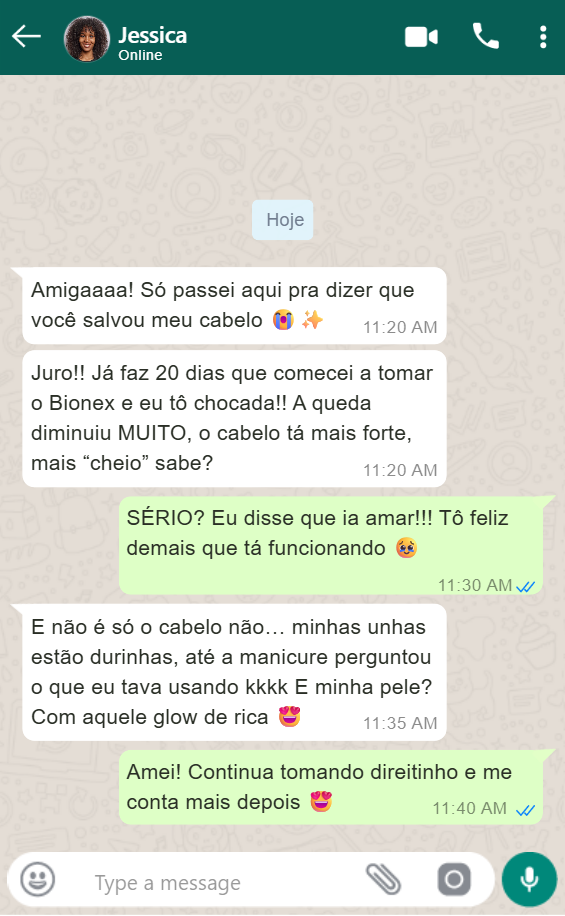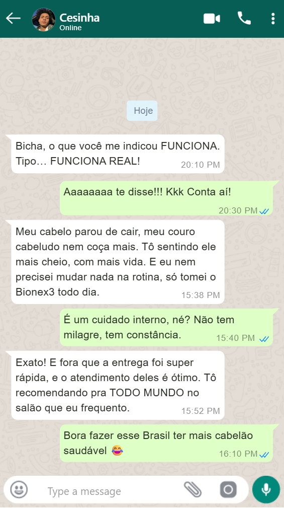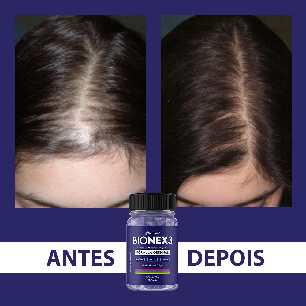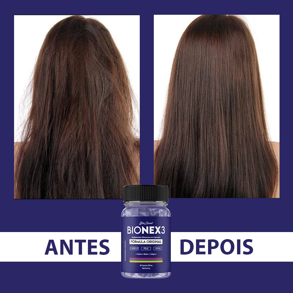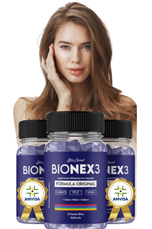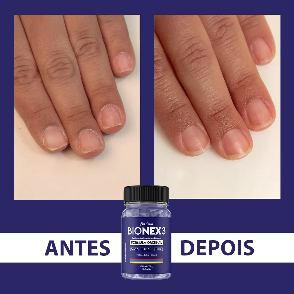 BioNex3 é um suplemento de última geração, desenvolvido cientificamente para melhorar a saúde capilar, da pele e das unhas. Sua composição é 100% natural e segura, feita com uma poderosa combinação de nutrientes essenciais, sem aditivos prejudiciais, garantindo máxima absorção pelo corpo. Com o uso regular, os resultados são visíveis em poucas semanas, proporcionando cabelos, unhas e pele mais saudáveis, com maior vitalidade e beleza.